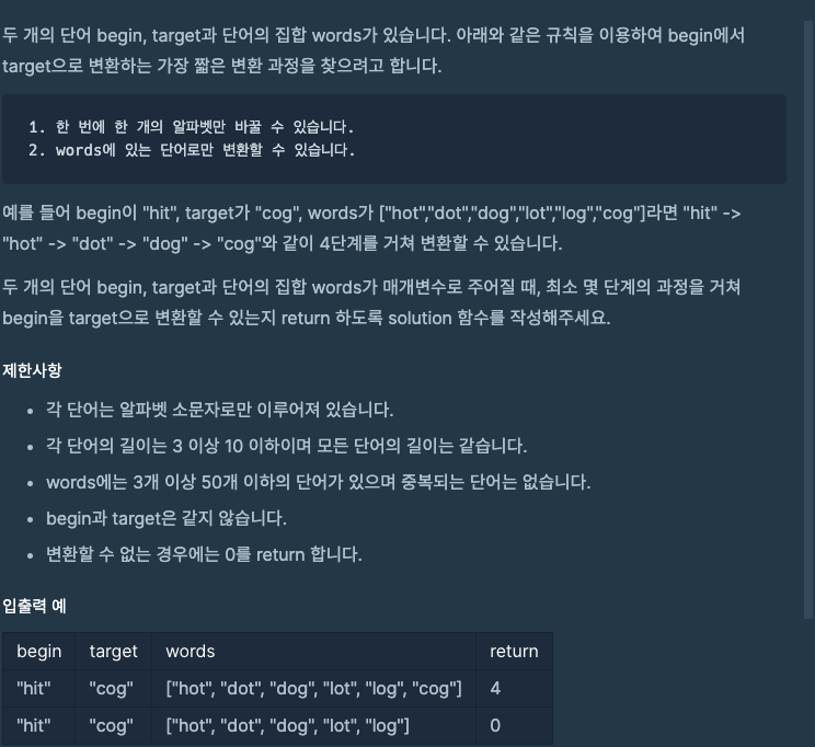 begin -> target으로 단어를 최소 몇 단계로 변환 가능한지 / 혹은 불가능한지 확인하는 문제이고