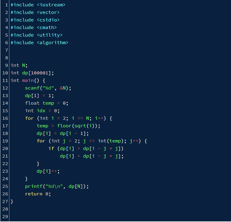 안일하게 가장 큰 제곱수(j*j)를 뺀 DP[i-j] + 1 이 DP[i]가 될 줄 알았는데
