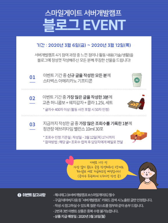 | [서버개발캠프] 블로그 이벤트 당첨!!! (0) | 2020.03.23 |