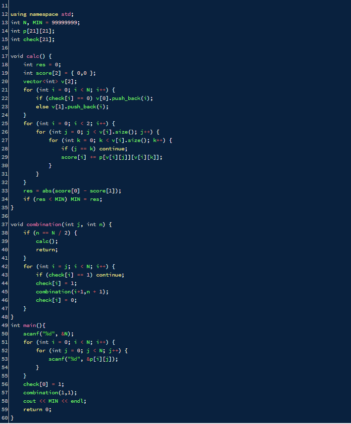축구팀원들의 조합을 골라 두 팀간의 능력치 차의 최소값을 구하는 문제