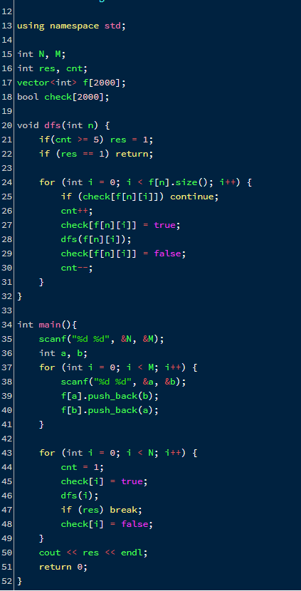 5명이 연쇄적으로 친구이면 1을 출력하면 되는 문제