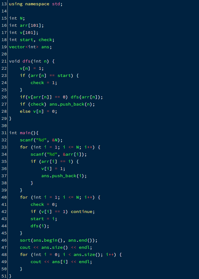 DFS 써서 시작점과 같이 돌아오면 ans vector에 넣어줌녀 바로 끝